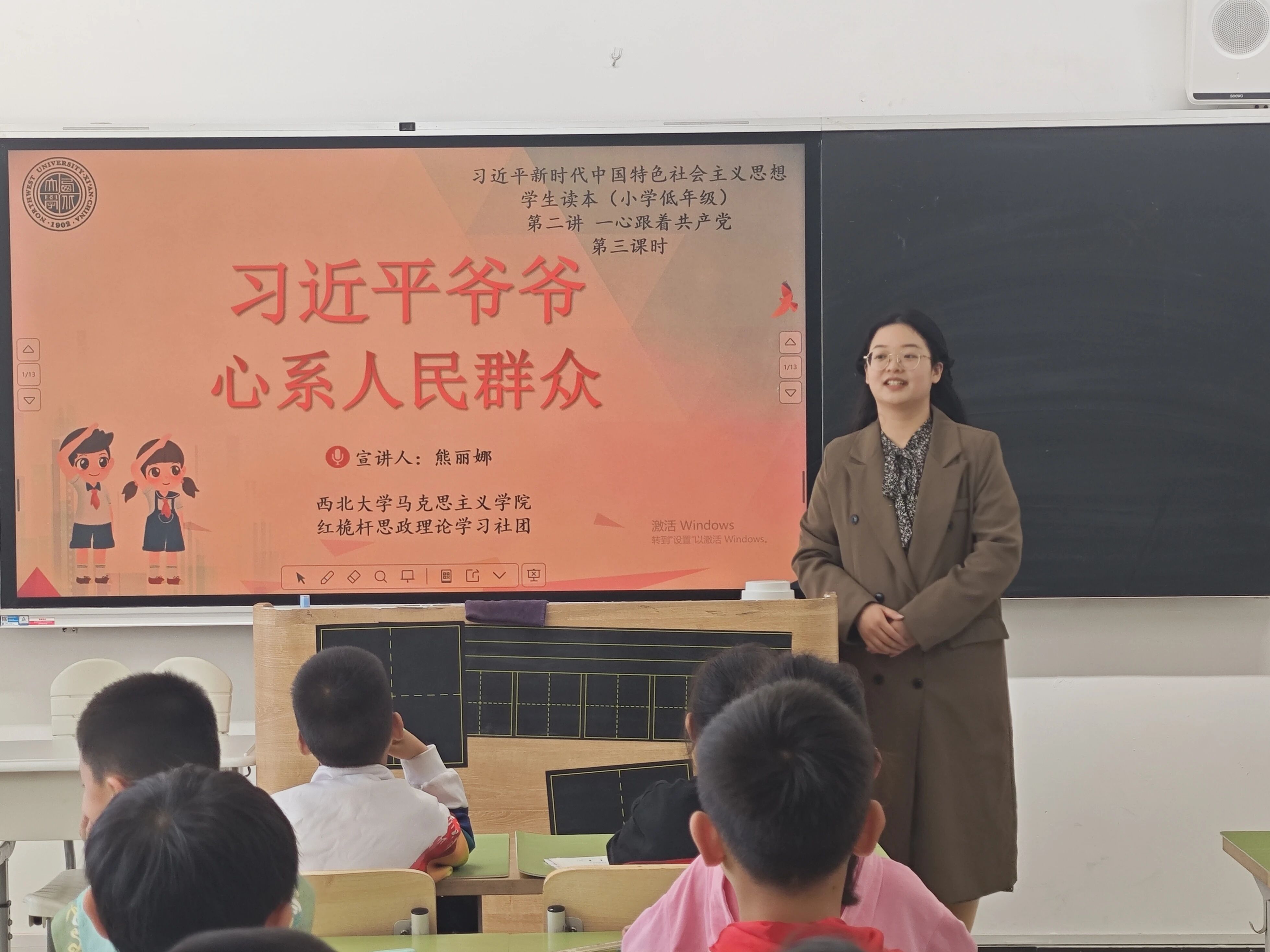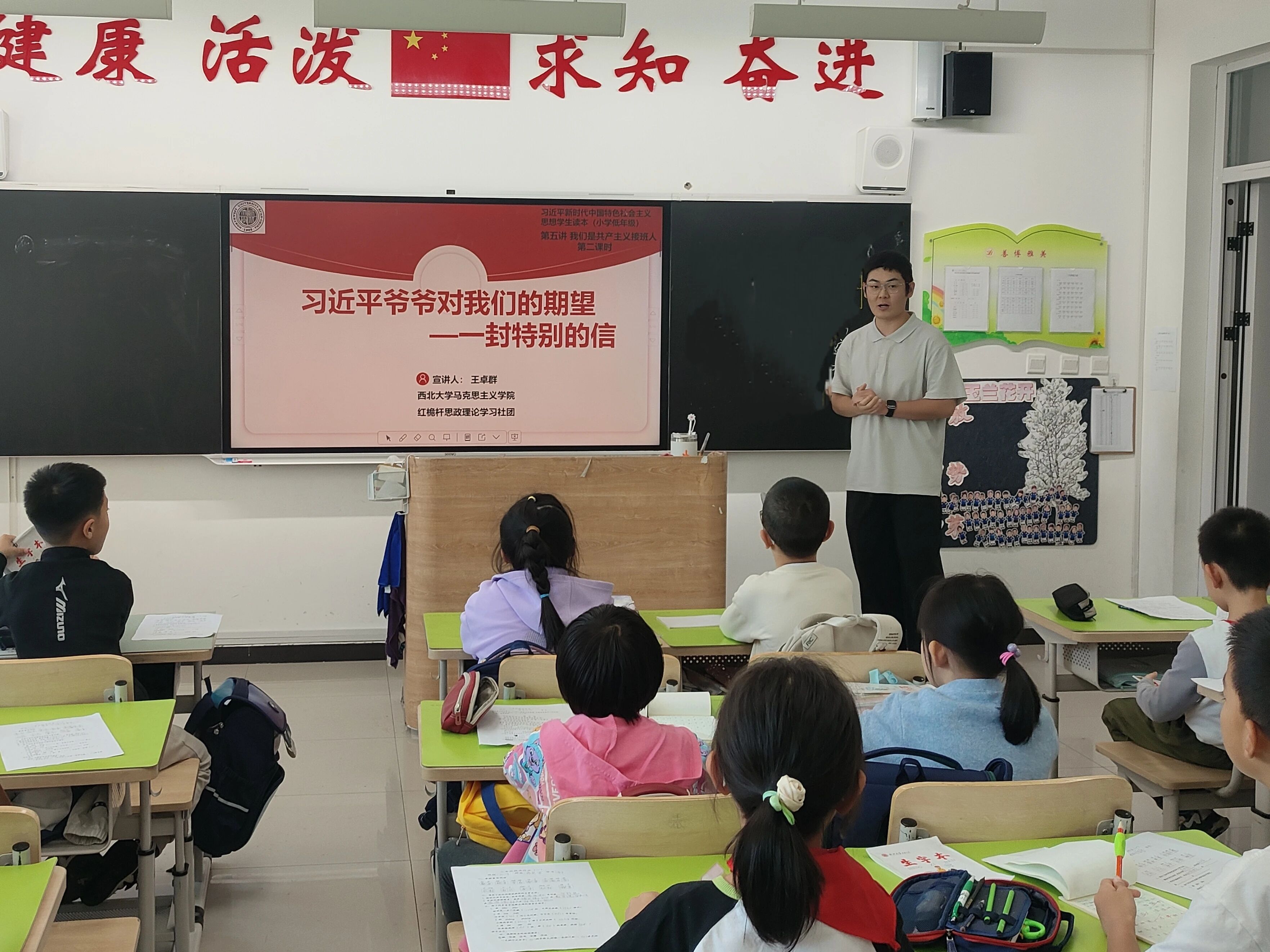 9月24日,我院红桅杆思政理论学习社团在西安市长安区第一小学实验小学,以《习近平新时代中国特色社会主义思想学生读本》(小学低年级)为主要内容,为二年级的小学生讲授思政课。主讲人分别是来自2024级和2025级的马克思主义基本原理、思想政治教育、马克思主义中国化研究与中国近现代史基本问题研究专业的12名硕士研究生。