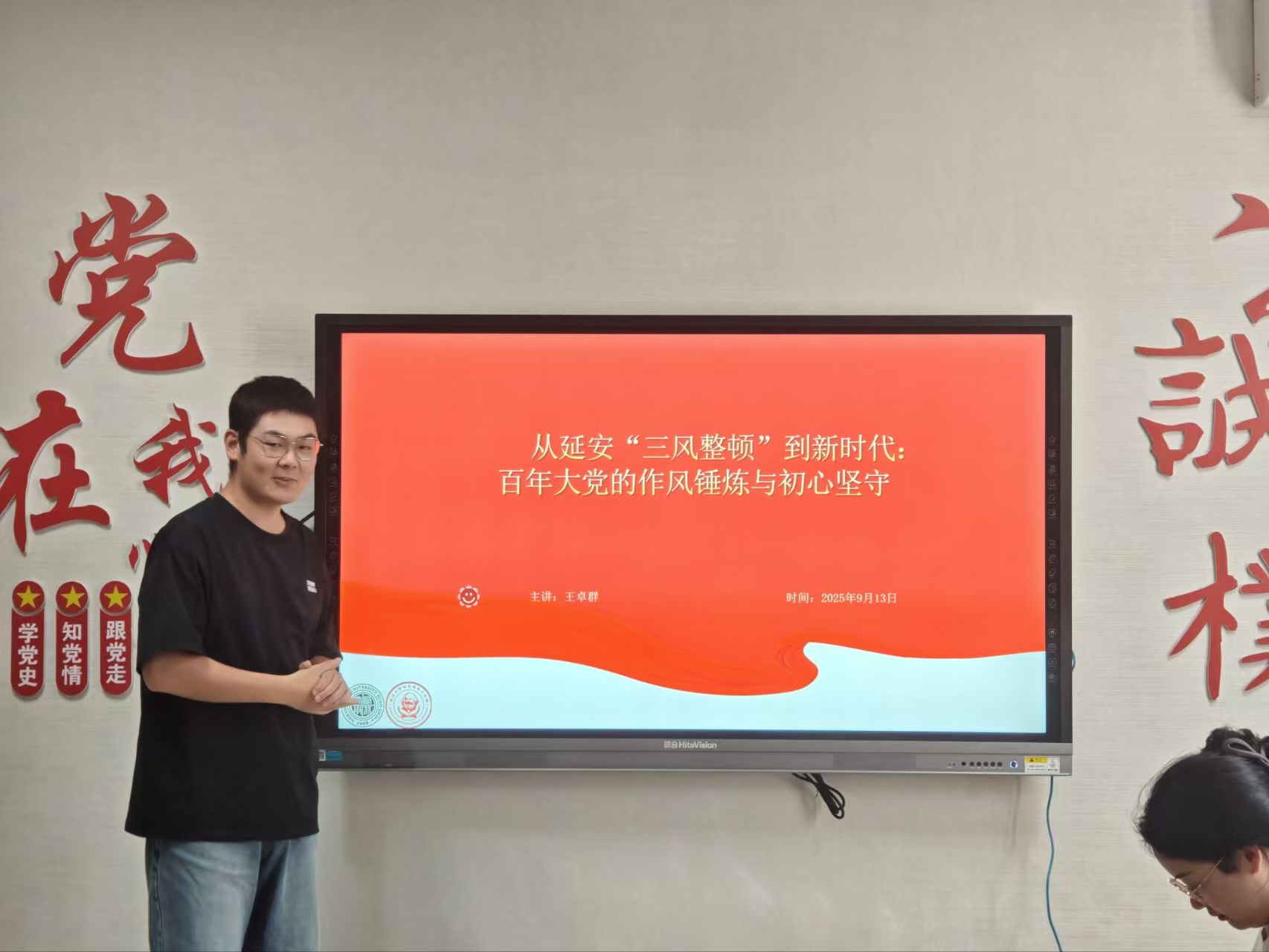 王卓群以《从延安“三风整顿”到新时代:百年大党的作风锤炼与初心》为题,讲述了延安整风运动的背景、内容和时代价值,勉励大家要始终保持优良作风,自觉践行全心全意为人民服务的根本宗旨。