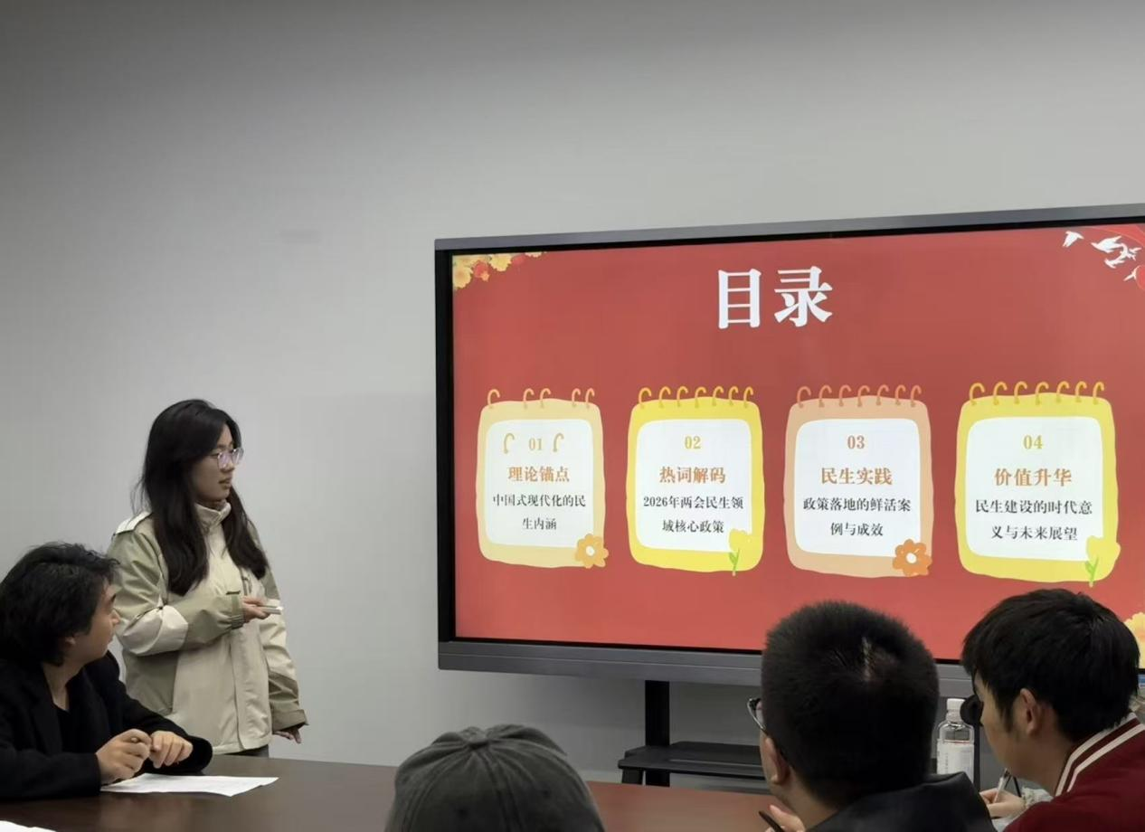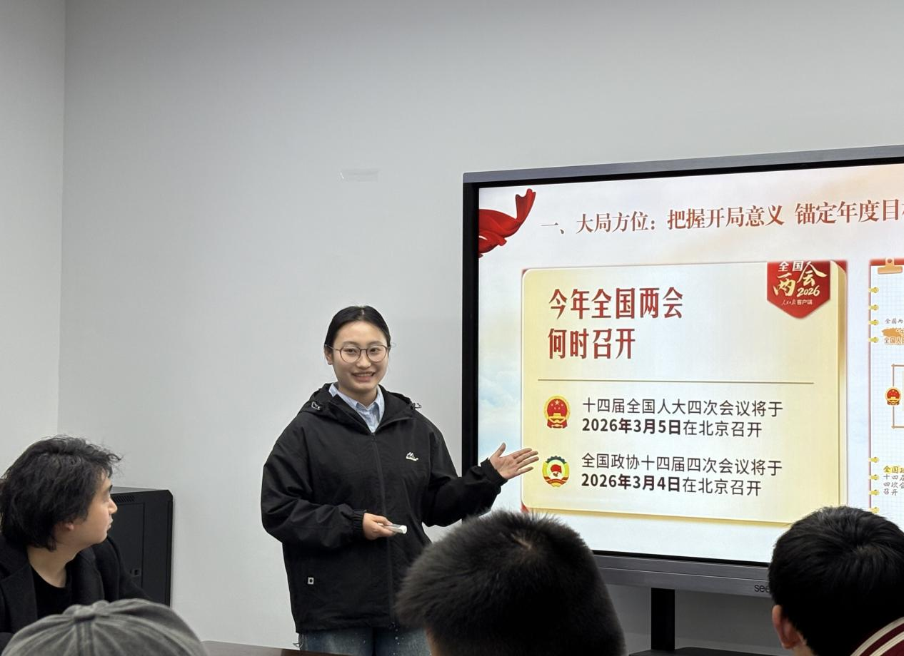 刘宇同学以《2026年两会热词彰显鲜明民生底色》为题展开宣讲。她从理论层面切入,阐述了中国式现代化以人民为中心的根本立场。接着聚焦“一老一小”、就业增收等民生热点,解读两会如何回应百姓关切。最后落脚到民生不仅是现代化建设的出发点,更是稳稳的底座和持续的动力,带领同学们深入理解了“两会”精神背后的民生温度。