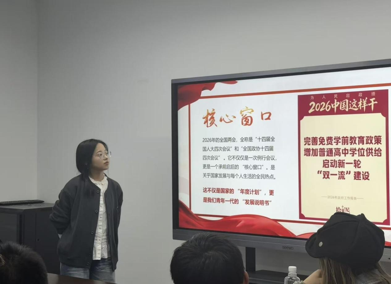 王婷同学以《深学细悟“两会”精神,挺膺担当青春作为》为题展开宣讲。她结合2026年全国两会与“十五五”开局的时代背景,重点围绕教育、就业两大青年关切领域解读两会核心部署。列举了“十四五”期间高等教育取得的成果,同时分享了“十五五”期间提质扩容、分类发展的规划方向,直面青年在就业中遇到的实际困惑,建议大家把个人发展融入国家大局,用实际行动践行青春使命。